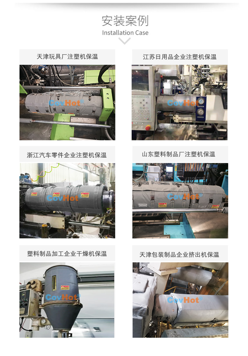 塑料制品行業(yè)的注塑機在工作時,需要對物料進行加熱處理,內(nèi)部溫度高達300℃以上。注塑機節(jié)能保溫罩產(chǎn)品可以有效節(jié)能省電,以達到注塑機保溫隔熱的效果,從而提高加工合作率。使注塑機表面溫度降低至50℃以內(nèi),降低車間的整體溫度。