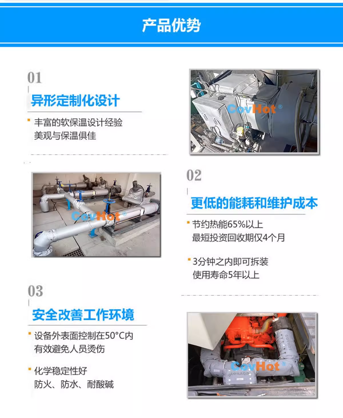1.絕熱保溫效果好,采用柔性耐高溫材料,耐溫可達(dá)1000℃以上。