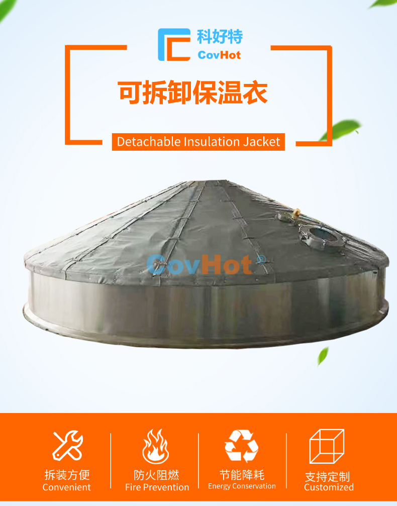 COVHOT®柔性可拆卸式糖化鍋鍋蓋保溫套保溫衣采用多層工業級材質復合制成,常用的材料多達二十余種,考慮到設備溫度,現場工況,預期的節能效果等因素,另外根據保溫材質的導熱系數,憎水性,耐磨性,耐酸堿性,防火等級,耐油污性能等情況,科好特會為客戶選擇不同的材質搭配,來滿足客戶多樣化及個性化節能保溫需求。